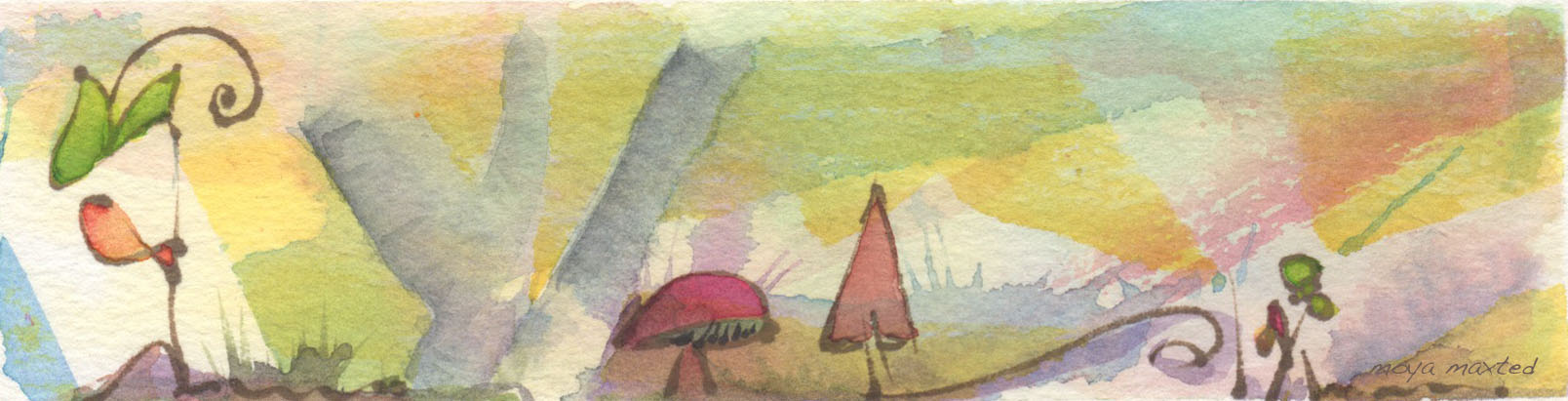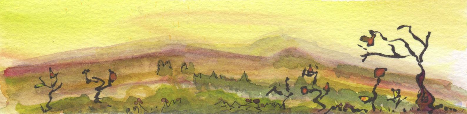 The last of my tiny paintings… for now, at least. I am liking to paint a bit bigger these days. These were washes that cured for many weeks on the boards before inspiring the remainder of each piece. I had originally thought that the first of these three was a stand-alone, left over from some partly finished group. After examining them more closely today, I discovered that they have common markings on the backs, were all cut from the same sheet of 140 lb. paper, and will now be considered a trio of sorts. We do love to hang out with our tribe, yes?